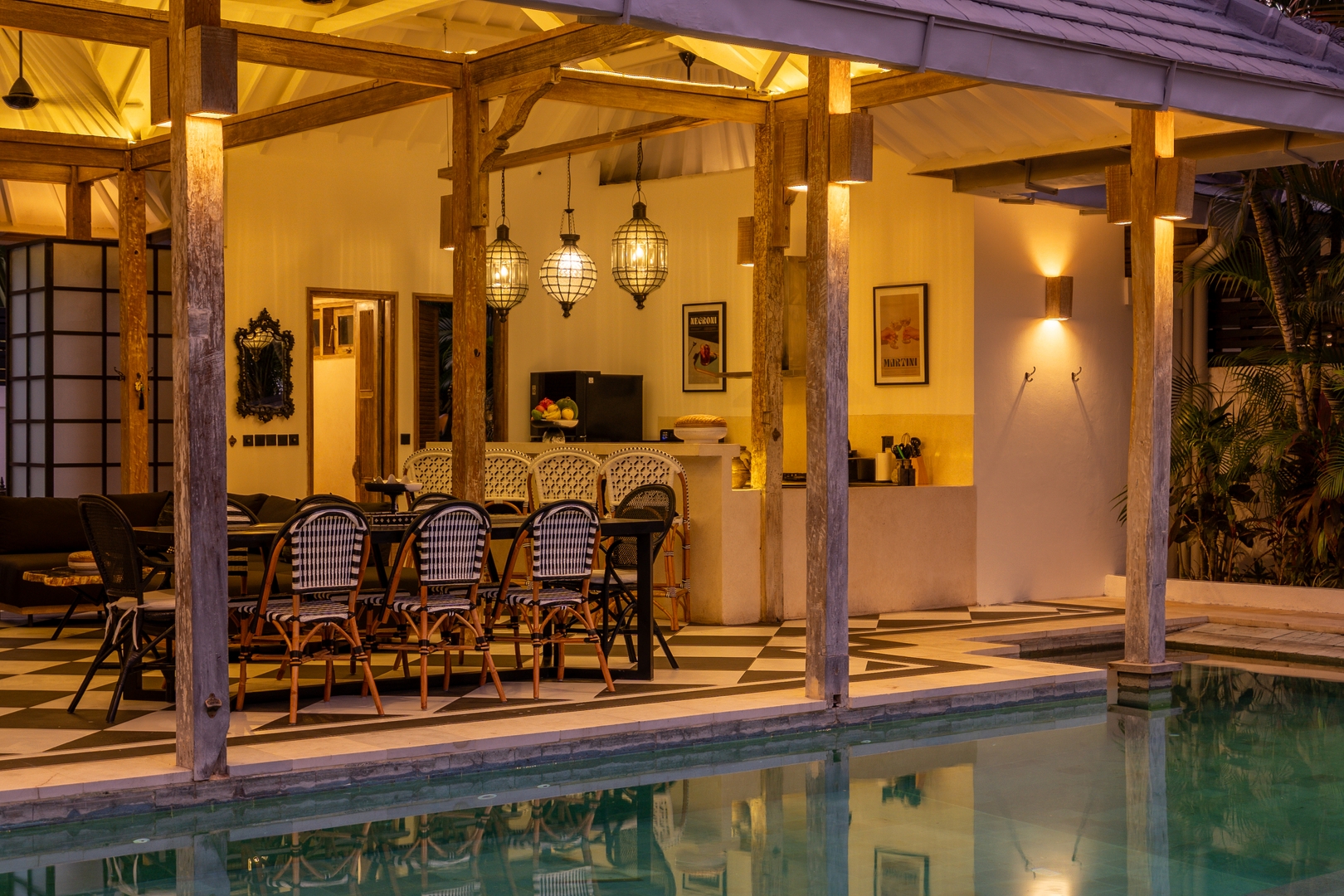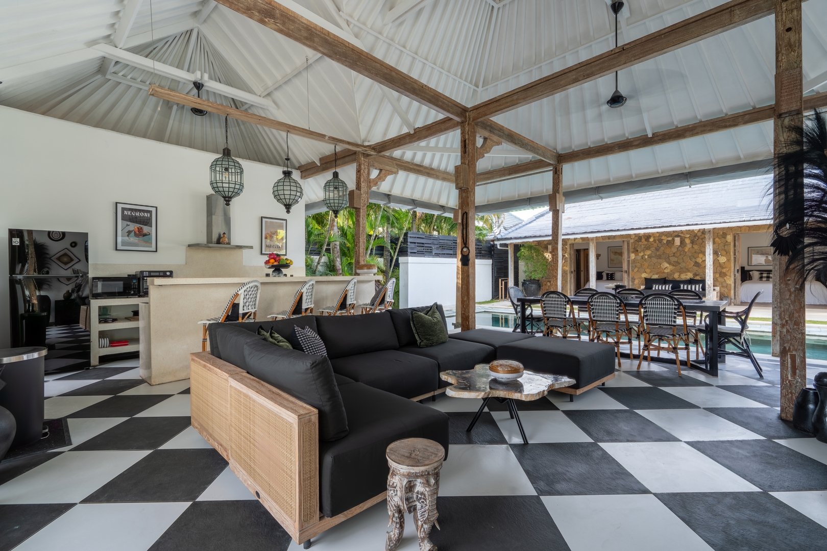 Step into this warm, tropical villa featuring natural wood accents, high ceilings, and open-plan spaces that flow effortlessly from indoors to out. Settle into the spacious living and dining area, where rustic wooden beams, clean white walls, and rattan pendant lights create a relaxed island vibe. Surrounded by tropical greenery, the space stays cool and breezy thanks to ceiling fans throughout.