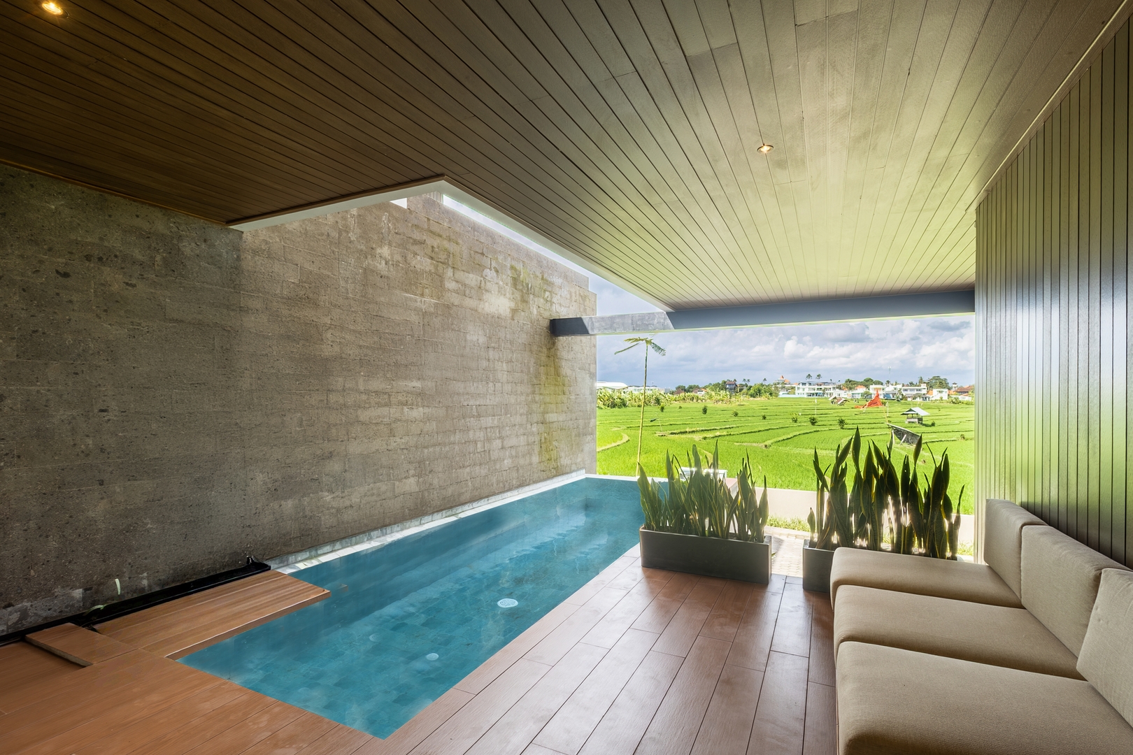 • Stylish open-plan living area with expansive glass doors overlooking the pool & rice-field landscape