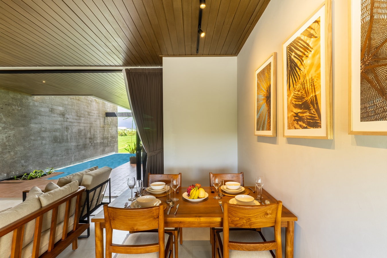 Designed for guests who appreciate refined aesthetics and comfort, Madison Villa delivers a sophisticated atmosphere with airy interiors, elegant finishes, and seamless indoor–outdoor living. Sunlight flows through wide glass doors, revealing relaxing views of the private pool and surrounding paddy fields — creating a beautiful backdrop for leisure, remote work, or extended stays.