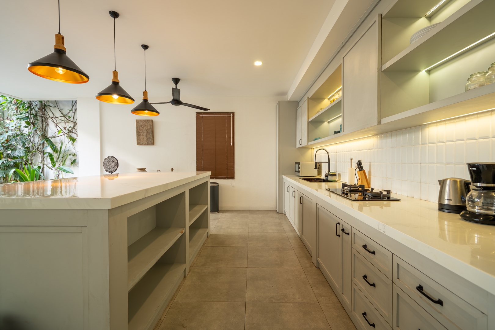 • A sleek fully equipped kitchen with bar seating and an adjoining poolside dining area — perfect for shared cooking sessions or leisurely meals