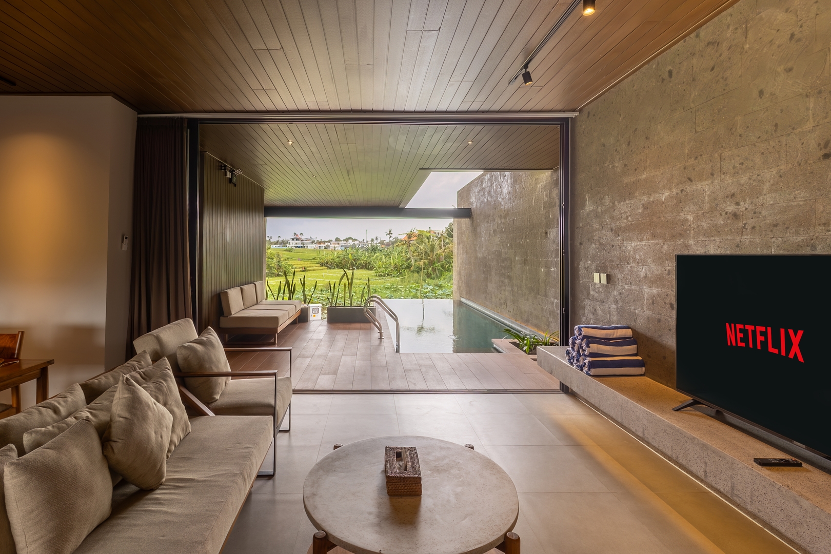 • Open-plan living area framed by floor-to-ceiling glass doors with tranquil pool & rice-field views